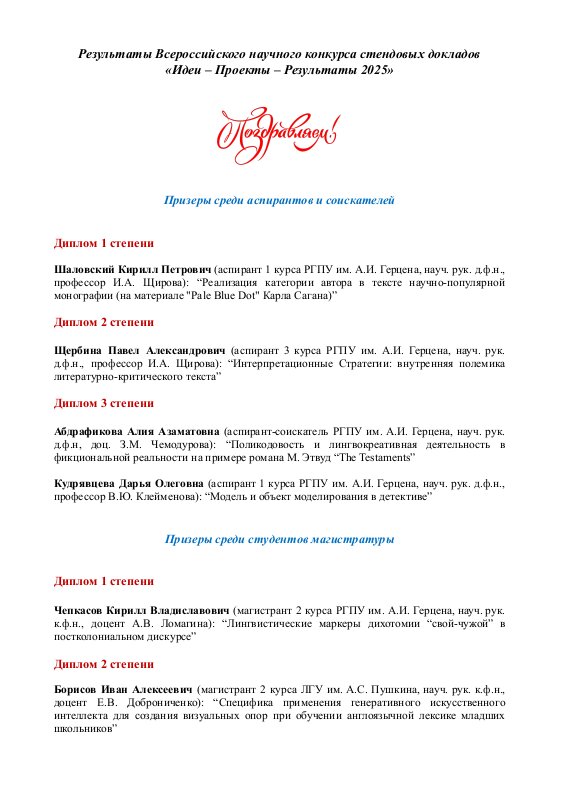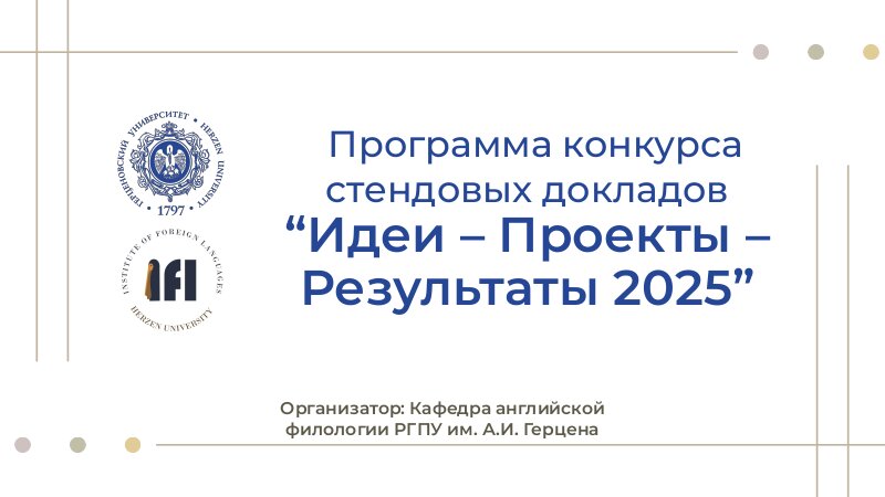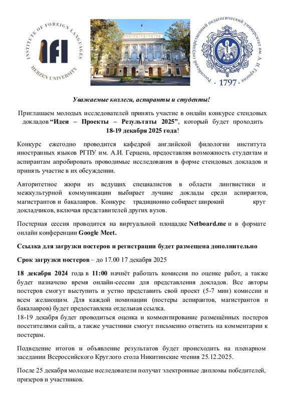Конкурс стендовых докладов "Идеи-Проекты-Результаты" ежегодно проводится кафедрой английской филологии института иностранных языков РГПУ им. А.И. Герцена.