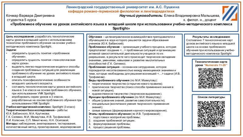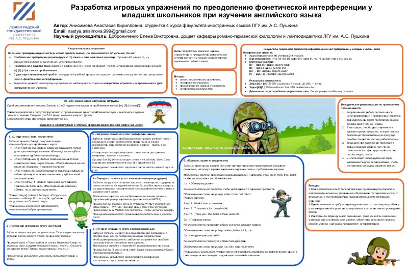 Анисимова Анастасия Кирилловна, студентка 4 курса факультета иностранных языков ЛГУ им. А.С. Пушкина, «Разработка игровых упражнений по преодолению фонетической интерференции у младших школьников при изучении английского языка»