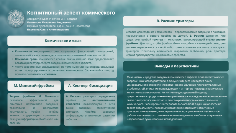 Ильенкова Елизавета Андреевна, аспирант 2 курса РГПУ им. А.И. Герцена, "Когнитивный аспект комического"
