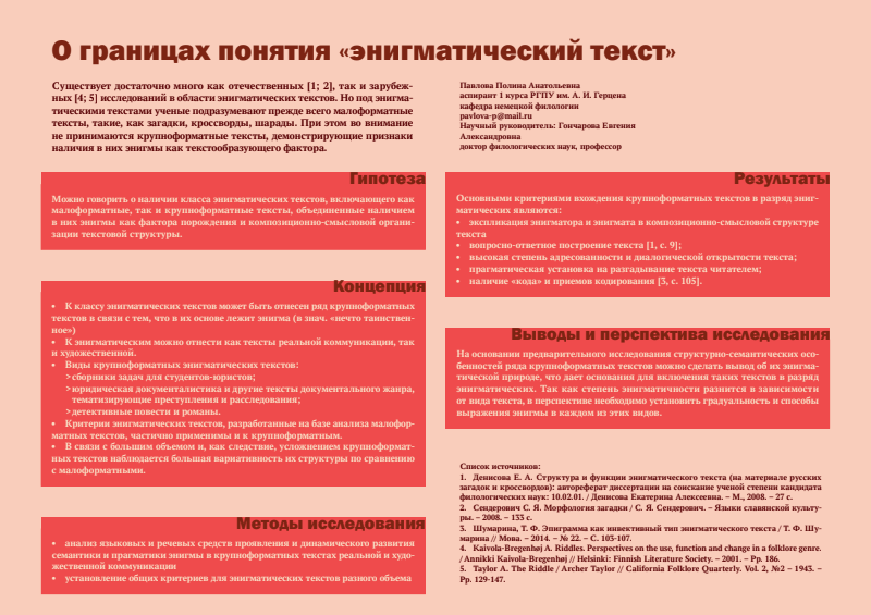 Павлова Полина Анатольевна, аспирант 1 курса РГПУ им А.И. Герцена «О границах понятия "энигматический текст"»